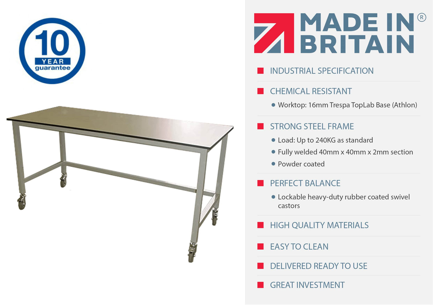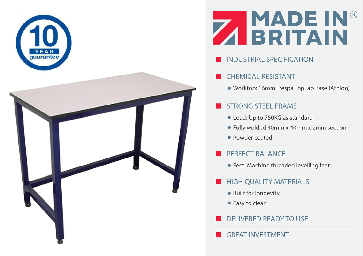 At Lab Tables, we specialise in designing and manufacturing high-quality laboratory tables tailored to your specific needs. Our bespoke science lab desks and benches feature durable Trespa worktops and robust steel frames, ensuring longevity and reliability. With over 35 years of experience, we proudly offer a 10-year guarantee against normal failure, reflecting our commitment to quality and customer satisfaction.